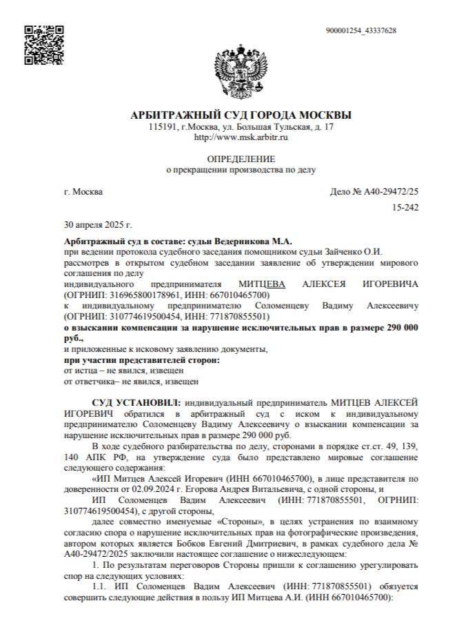 По истечении срока ответа правообладатель имеет право обратиться в суд. В таком случае сумма требований увеличивается, добавляются судебные расходы, и итоговая компенсация, как правило, оказывается выше, чем предложение в досудебном порядке.