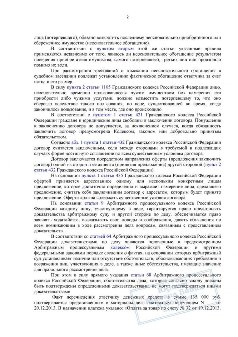 • Факт перечисления денег. Представленным платёжным поручением № 675 от 20.12.2013 подтверждено, что истец перечислил ответчику 135 000 руб. с назначением платежа: «Оплата за товар по счёту № 32 от 19.12.2013».