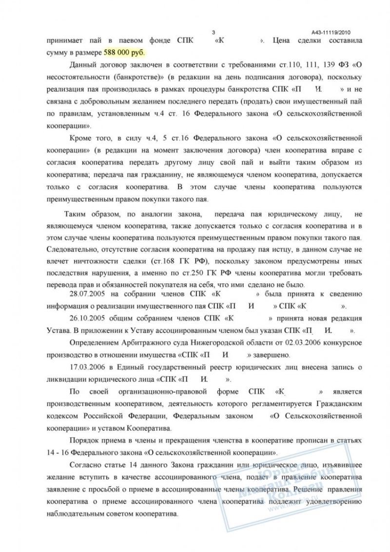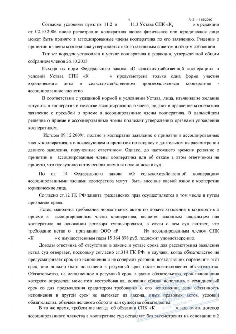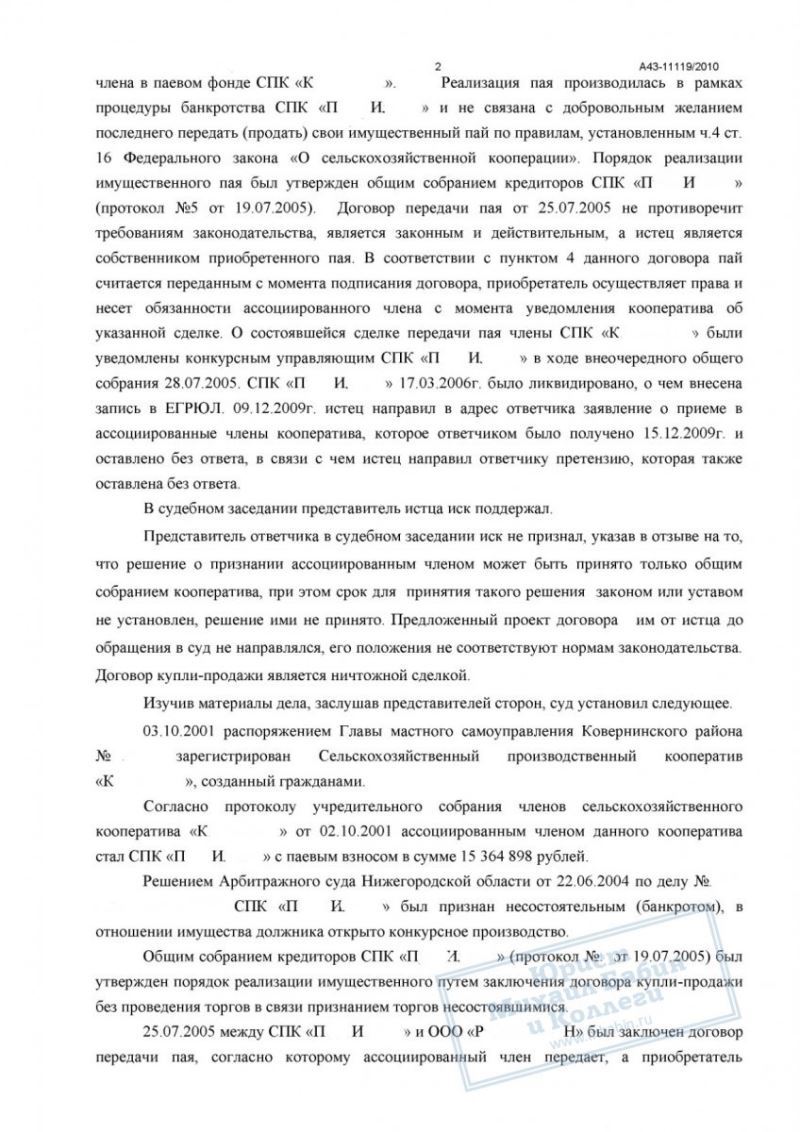Аргументация строилась на положениях Федерального закона «О сельскохозяйственной кооперации» и Гражданского кодекса РФ. Мы указали, что: