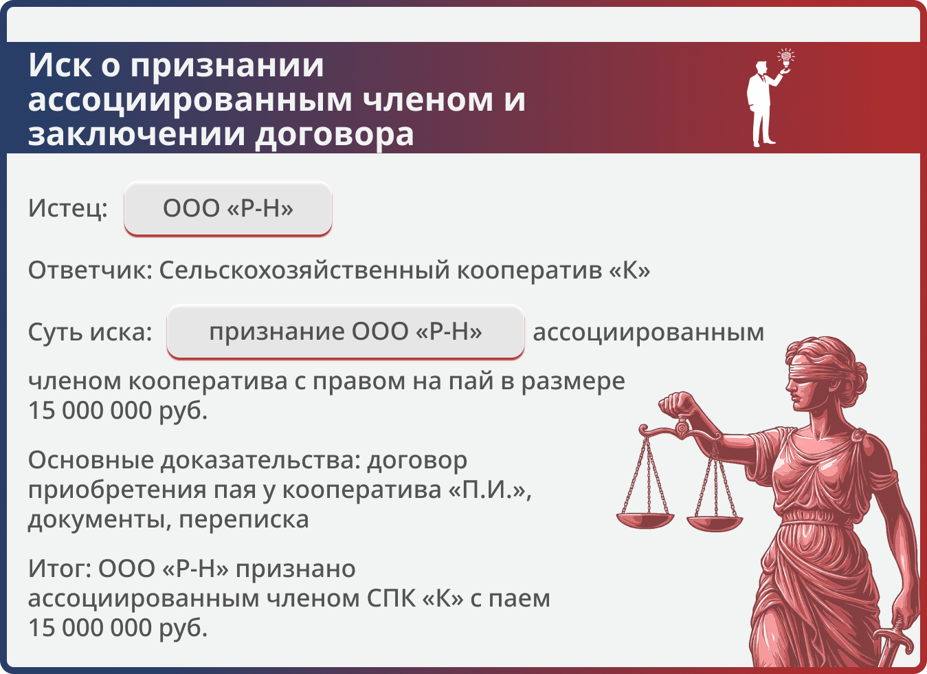 Кооператив «К» не признавал ООО «Р-Н» пайщиком, ссылаясь на уставные ограничения и отсутствие решения общего собрания. Мы подготовили и направили в суд иск о признании ООО «Р-Н» ассоциированным членом кооператива с правом на получение дивидендов от стоимости пая. В ходе судебного разбирательства были представлены доказательства приобретения пая, правопреемства в связи с ликвидацией первоначального пайщика и отсутствие устава кооператива, препятствующего такому переходу.
