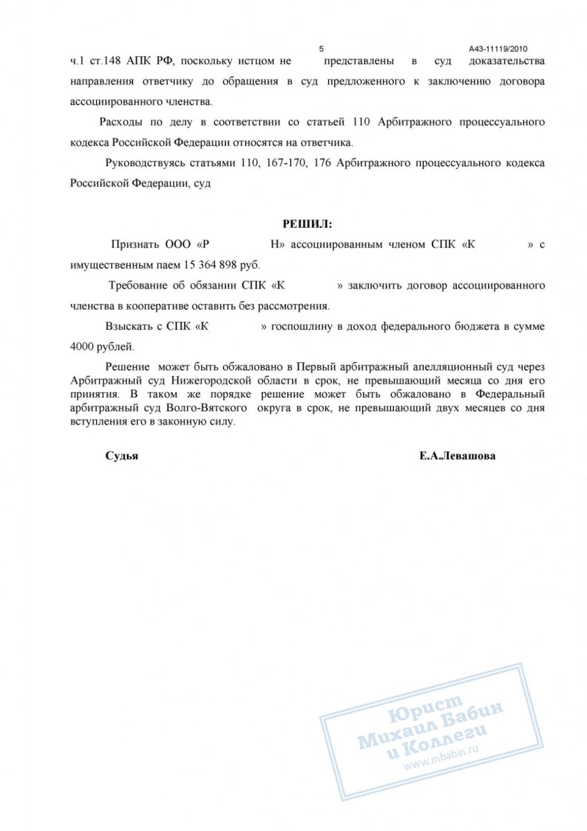 Арбитражный суд признал требования ООО «Р-Н» обоснованными. ООО «Р-Н» стало ассоциированным членом СПК «К» с паем в размере 15 000 000 руб. Кооператив обязан включить новую организацию в реестр пайщиков и выплачивать причитающиеся дивиденды.