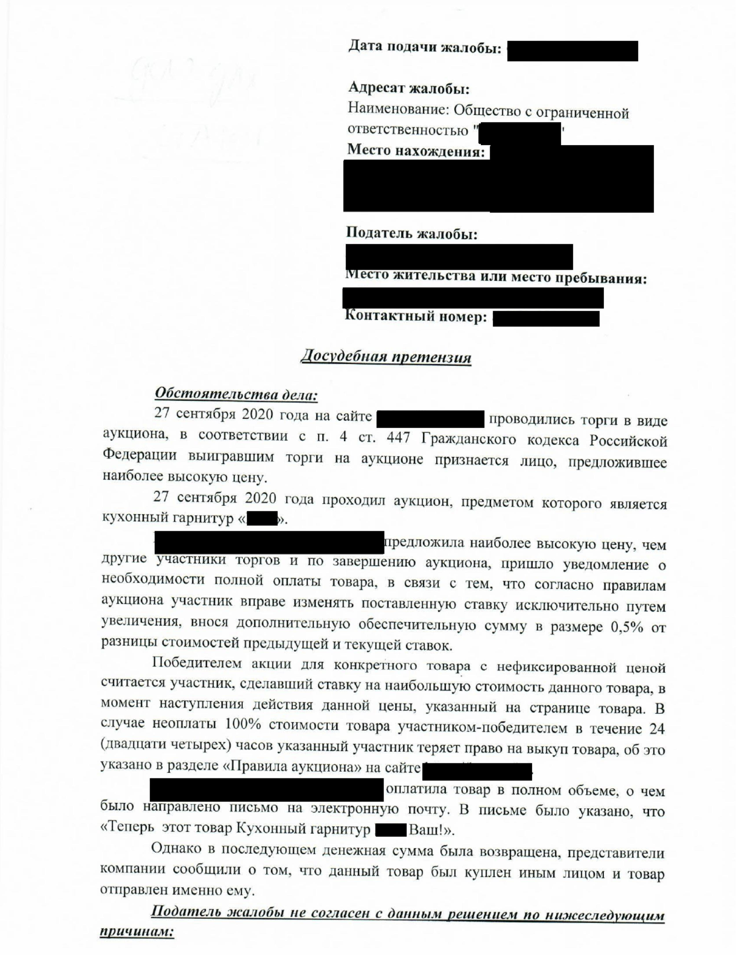 В компанию "Оригинальное решение" обратилась Клиент за помощью в получении товара (кухонного гарнитура), который она выиграла по результатам проведенного аукциона. Она рассказала, что выполнила все правила аукциона, однако кухонный гарнитур так и не получила.