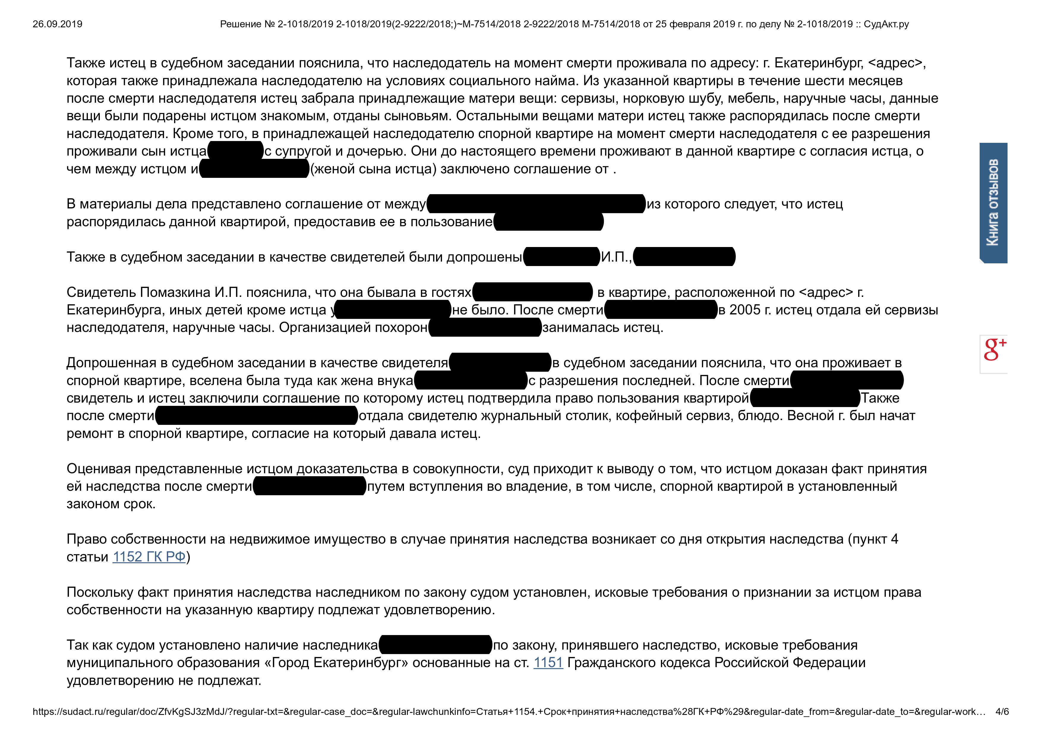 Суд решил: Признать за нашей клиенткой право собственности на жилое помещение в порядке наследования. В удовлетворении встречного иска муниципального образования «Город Екатеринбург» отказать в полном объеме.
