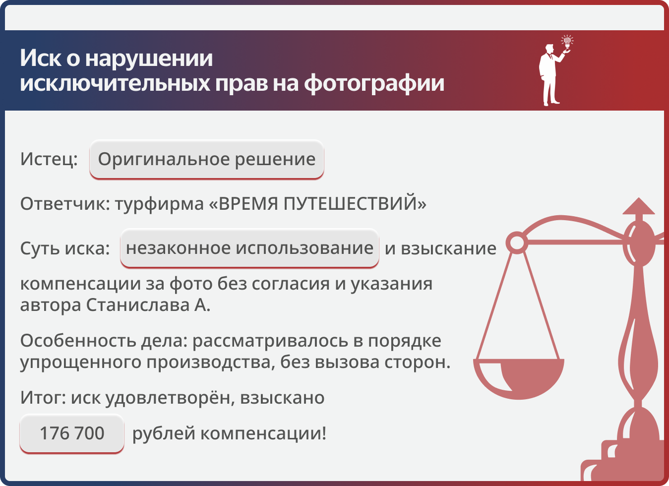 Долго не мог разобраться с недобросовестным использованием моих фотографий. Решил обратиться к ребятам из Оригинального решения. Я не тратил ни времени, ни нервов — всё делала команда. Очень благодарен за работу и особенно за денежную компенсацию)