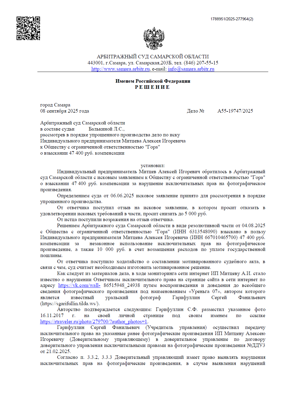 • Техническое подтверждение авторства: суду был представлен полноразмерный файл в формате RAW и скриншоты метаданных, подтверждающие создание фото именно Гарифуллиным в 2017 году.