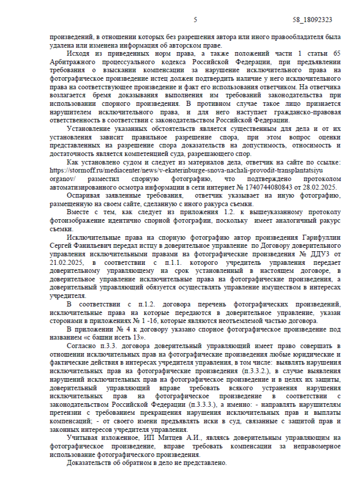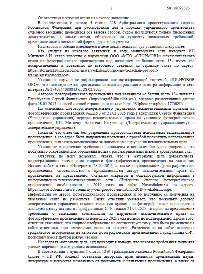 Нарушение было зафиксировано автоматизированной системой «Цифровое Око»: на сайте медицинской компании ООО «МТО «СТОРМОВЪ» в новостной статье использовалось фотографическое произведение «с башни Исеть 13». Мы собрали доказательства, подтвердили авторство фотографа Сергея Гарифуллина и направили иск в Арбитражный суд Московской области. Дело рассматривалось в порядке упрощённого производства.